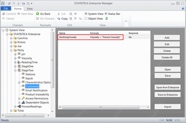 Constraints can be defined in which the value to be entered in a given Data Entry Setup is dependent on a value entered in a previous Data Entry Setup in that Data Entry Sequence. In this context, the preceding Data Entry Setup is referred to as "Parent." For example, if we want to ensure that the Viscosity of StageTwo is less than the Viscosity of StageOne, the constraint would look like this: