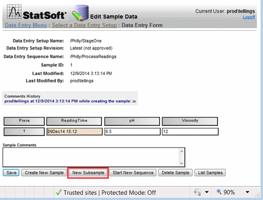 After you enter data for the first Data Entry Setup, StageOne in this example, you can click New Subsample to advance to the next Data Entry Setup in the Data Entry Sequence, StageTwo in this example.
