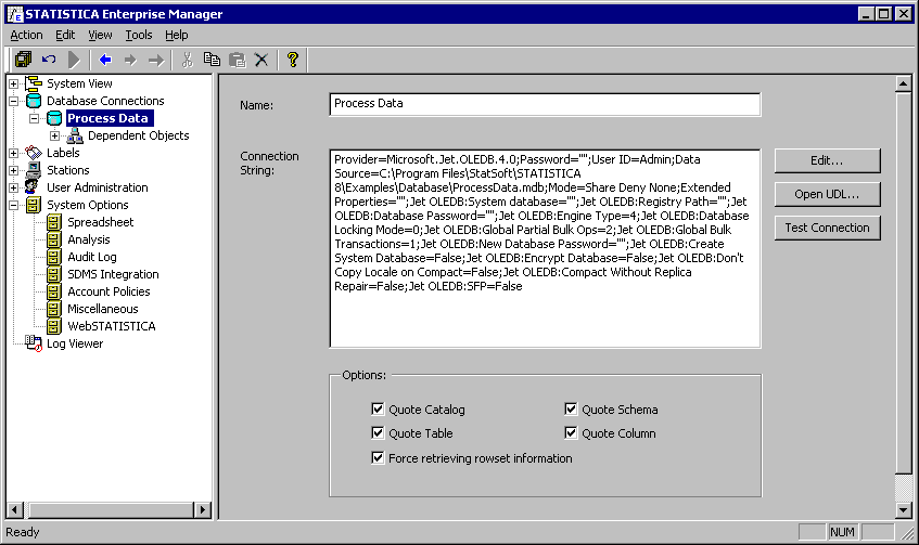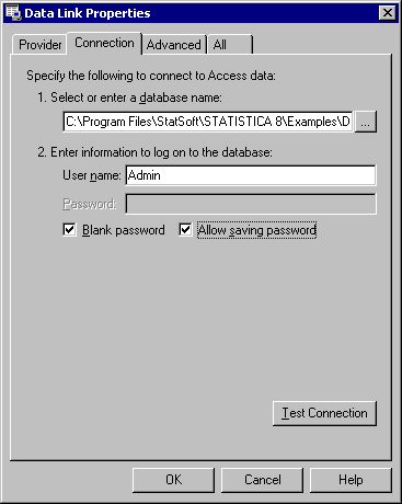 On the Connection tab, click the button adjacent to the Select or enter a database name field. There is a set of example databases in MS Access format installed with Statistica. For this example, we will connect to the ProcessData.mdb database. Browse to the location in which Statistica has been installed (by default C:\Program Files\StatSoft\STATISTICA).
