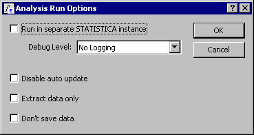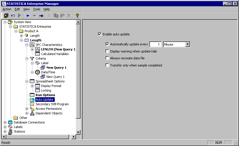 The last important option to be reviewed in this example is the Auto Update node. If the Data Configuration on which the Analysis Configuration is based has one or more columns set to be an Auto Update column, then the options here will be enabled, allowing for the definition of the frequency by which STATISTICA queries the database for new data.