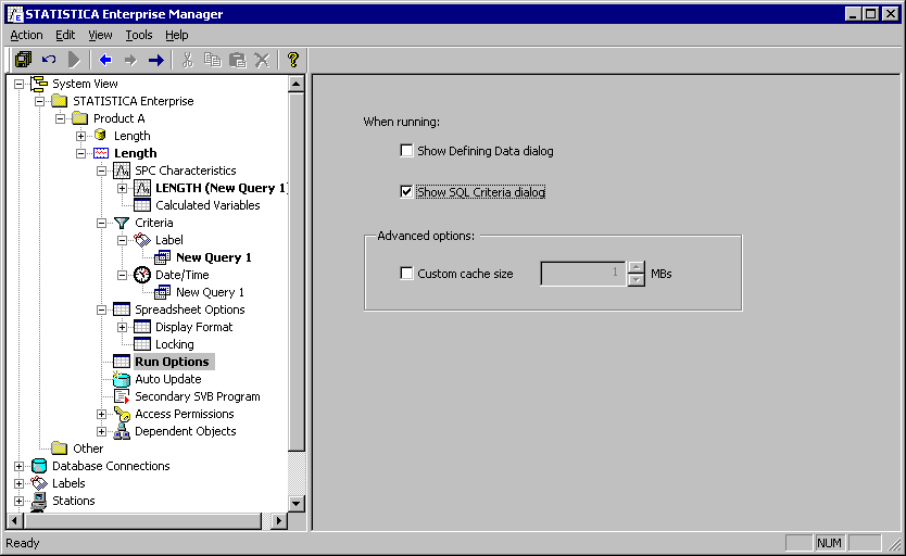 Browse to the Run Options node in the Analysis Configuration. There are two optional filtering dialogs available to be displayed to the end user of this Analysis Configuration at run-time. The SQL Criteria dialog is a common selection for those Analysis Configurations that required filtering by the user at run-time since it supports hierarchical filtering (step-by-step filtering where the options presented in subsequent steps are based on the user's previous selections). Select the Show SQL Criteria dialog check box as shown below.