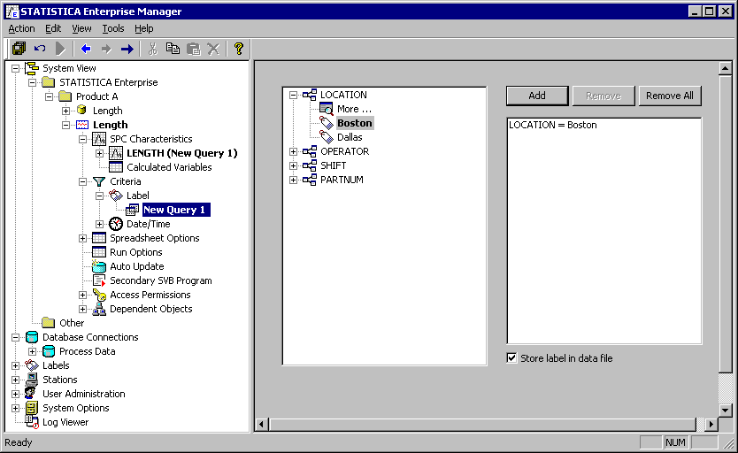 Browse to the Criteria node in this Analysis Configuration. Importantly, each Analysis Configuration allows for additional specific filtering to be stored as part of its configurations. This is important because often it is most efficient to define a very broad Data Configuration to define the querying of data and then perform the specific filtering for the analysis either in the Criteria defined in the Analysis Configuration or by configuring the Analysis Configuration to allow for run-time filtering by the end user; this allows for the fewest number of Data Configurations to be set up and managed to define the data for the largest number of Analysis Configurations. Note that the items listed in the Label subfolder of the Criteria folder are those that were defined as the Target Type - Label in the Data Configuration. As shown below, you can browse the list of values in the LOCATION column. Click the Add button to analyze only the data from Boston.