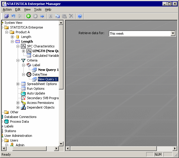 The other node in the Criteria node is Date/Time. When the Data Configuration contains a column set to Target Type - Timestamp, these options will be enabled. The default setting is This week, meaning that based on the current date and time at runtime for this Analysis Configuration, the data queried will be filtered to be only data from the current week. Note. If you do not visit the Date/Time criteria options dialog when setting up an Analysis Configuration, you will get a warning message when saving the configuration to the STATISTICA Enterprise Configurations Database.