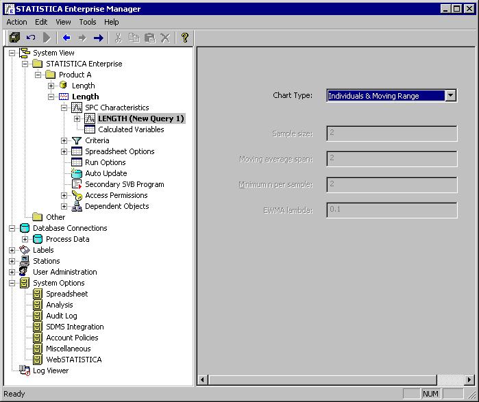Browse in the tree view to the SPC Characteristics sub-folder of this Analysis Configuration, and expand it. The set of characteristics (from the Target Types assigned to the columns in the Data Configuration) are listed. Select the Length characteristic. In the properties page, set the Chart Type to Individuals and Moving Range. The remaining options will then be disabled because they are irrelevant to that chart type.