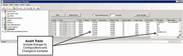 All Statistica Web Data Entry activities (including changes to configurations, entering new samples, editing samples, and reviews/approvals) are logged in the Statistica Enterprise audit trail log.