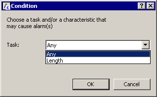When All conditions are met is selected, action is only taken if all the conditions in the list box are met, i.e., if all the specified characteristics from the specified tasks generate alarms.