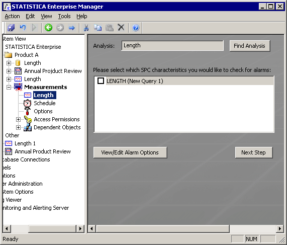 You will see a list of the variable characteristic(s) and/or attribute characteristic(s) that are charted by the selected Analysis Configuration. Select the check box next to the characteristic that should be checked for alarms. Then click the Next Step button.