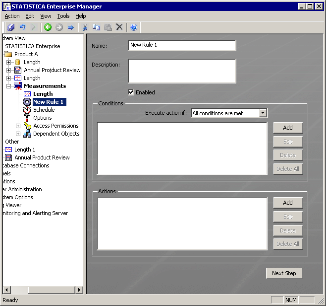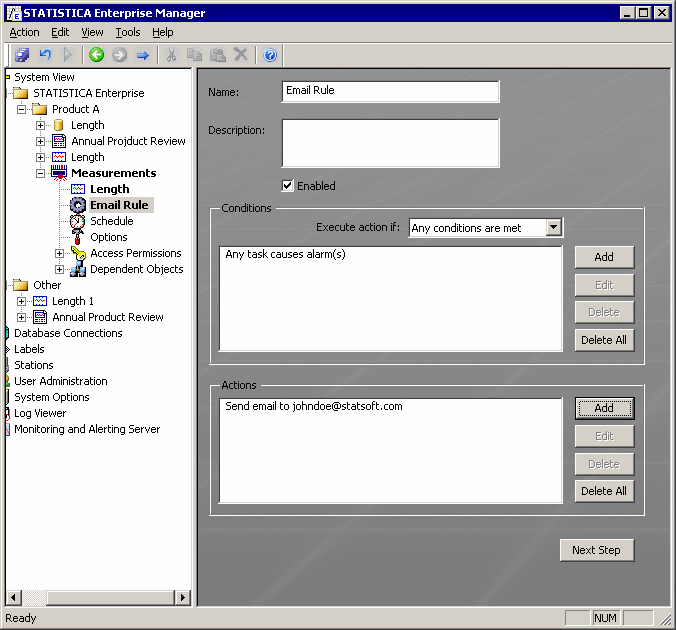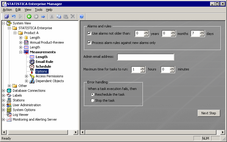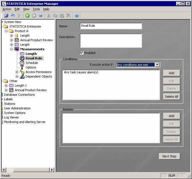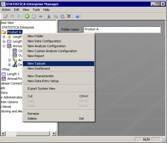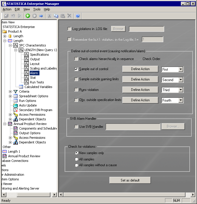 Server TaskSets require the STATISTICA Monitoring and Alerting Server (MAS). MAS is an application that is available as an add-on to STATISTICA Enterprise. It enables you to monitor groups of Analysis Configurations for alarms and other specified conditions, and to designate what actions will be taken when those alarms or specified conditions are detected. This approach allows for the efficient and automated, server-based analytic monitoring of specific data streams using SVB or IQC (Interactive Quality Control) Analysis Configurations. The underlying Analysis Conditions can specify any analysis to run in STATISTICA. For purposes of this example, the focus will be on Quality Control analyses, where the definition of alarms is defined in the Alarm Options of the IQC Analysis Configuration. For SVB Analysis Configurations, the approach is the same, except that the STATISTICA Visual Basic (SVB) script will need to have specific return codes designating the specific outcomes for MAS to monitor.