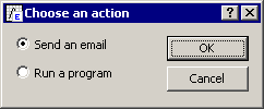 The options on this dialog enable you to specify what kind of action should be taken when the conditions specified in the Conditions group box have been met. You can choose to either send an email or run a program.