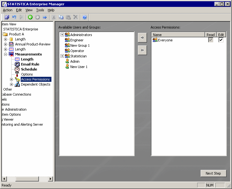 Click the Next Step button. The tree view automatically navigates to the Access Permissions node, and displays the current user permissions.