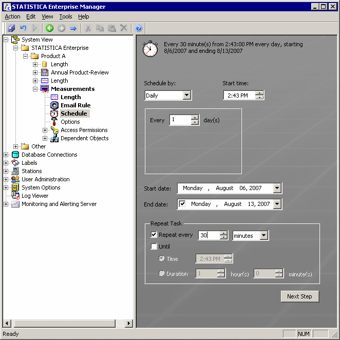 Now all the tasks in this task set will run every 30 minutes for the next week. If those tasks generate alarms, then action will be taken based on the Conditions and Actions specified previously in the Email Rule node.