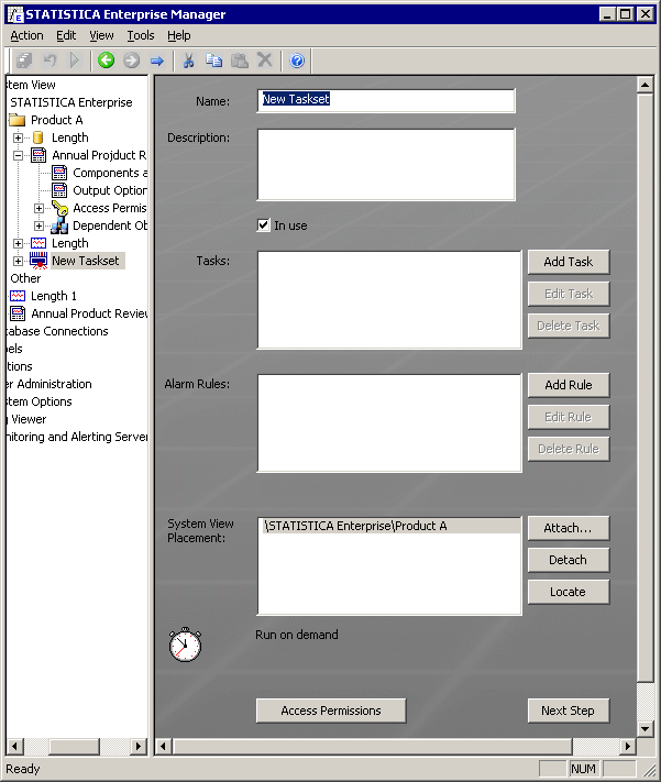 A child node of the Taskset is created that allows you to specify the rules that govern if and when alarms will be generated. The tree view automatically navigates to that node.