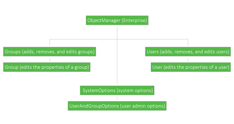 The objects available here enable you to manage the users and groups in an Enterprise system.