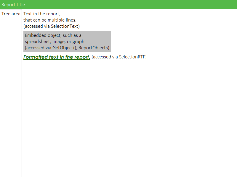 Reports consist of a content area and a tree area. The tree area is used to navigate the report's embedded objects (e.g., graphs, spreadsheets). The content area is the container for the text and embedded objects. Refer here for an explanation of how to include special formatting in your text. Likewise, refer here for an explanation of how to edit objects embedded in a report.