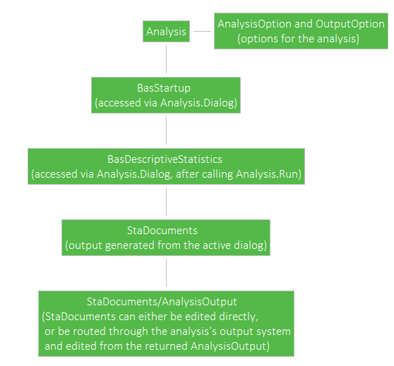 Within this Analysis object is a chain of StaAnalysisDialog objects, which represent the dialog options for the analysis. These dialogs objects or ordered in a sequence within the parent analysis. The analysis’s current dialog is access via the Dialog property, which will be an object derived from StaAnalysisDialog. Once you have specified the options that you prefer for this dialog, you will then navigate to the next dialog in the sequence using either the dialog’s OK function or the analysis’s Run function. The subsequent call to the analysis’s Dialog property will return the next dialog in the sequence, where you will then enter the options that you wish to have for this dialog. This process is repeated until you have reached the results dialog of the analysis, where you will then generate output.
