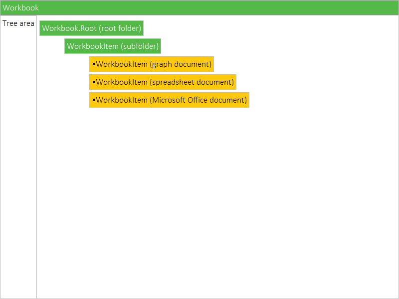 Workbooks consist of a content area and a tree area. The tree area is used to navigate the workbook's documents. The content area is the container for these documents.