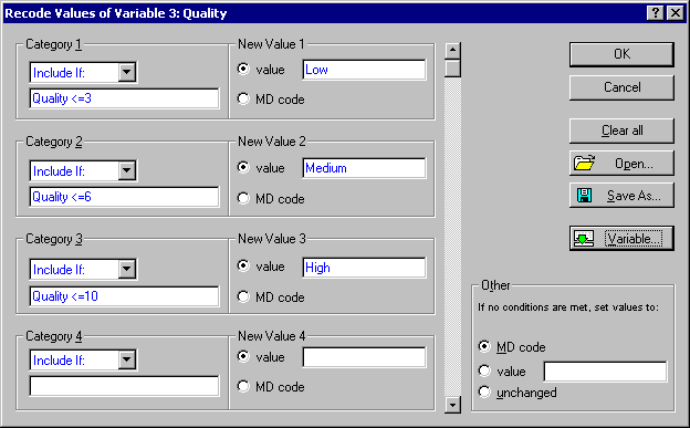 For example, the recoding conditions specified above would translate the values less than or equal to 3 of the current variable (Quality) into Low, the values greater than 3 and less than or equal to 6 into Medium, and the values greater than 6 and less than or equal to 10 into High. Note that any other values that occur in the Quality variable would be translated into the missing data code because the MD Code option button is selected in the Other group. Note also that Statistica first finds all cases that meet Category 1 and recodes them; then Statistica only searches through the remaining cases that have not been recoded to see if they meet Category 2. Hence, you do not have to specify Quality > 3 AND Quality <= 6 as Category 2.