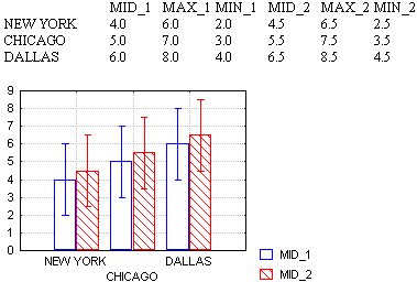 When you select this option button, the actual values of the mid-point, minimum, maximum values will be plotted. For example, for a mid-point value of 9, a minimum value of 1, and a maximum value of 12, the absolute range (as indicated by whiskers, boxes, or columns) would start at 1 and end at 12, with the mid-point at 9.
