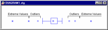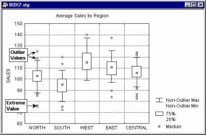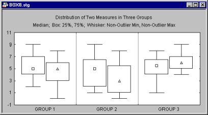 In box plots (this term was first used by Tukey, 1970), ranges of values of a selected variable (or variables) are plotted separately for groups of cases defined by values of a categorical (grouping) variable. The central tendency (e.g., median or mean) and range or variation statistics (e.g., quartiles, standard errors, or standard deviations) are computed for each group of observations, and the selected values are presented in the style specified in the Graph Type. Outlier data points can also be plotted (see Outliers and Extremes, below).