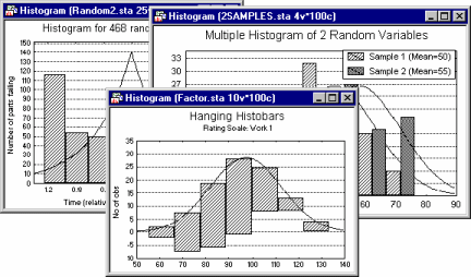 Often the first step in the analysis of a new data set is to run histograms on all variables. [Note that if more than one variable is selected for any type of univariate Histogram (see below), a series of graphs, one for each variable, will be created and can be reviewed in a results workbook, report, or cascade of stand-alone windows; see Five Channels for Output from Analyses.]