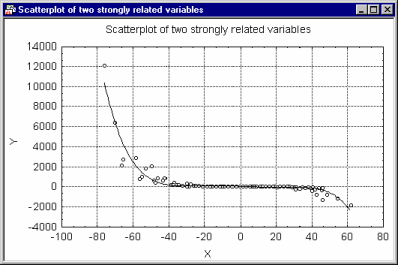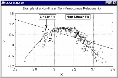 Another aspect of relationships between variables that can be examined in scatterplots is curvilinearity. There are no "automatic" or easy-to-use tests to measure curvilinear relationships between variables: The standard Pearson r coefficient measures only linear relations; some nonparametric correlations such as the Spearman R can measure curvilinear relations, but not non-monotonous relations. Examining scatterplots allows one to identify the shape of relations, so that later an appropriate data transformation can be chosen to "straighten" the data or select an appropriate nonlinear equation to be fit.