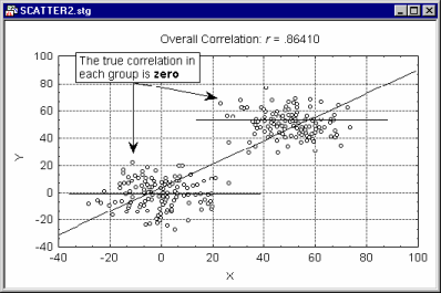 In this example, the high correlation is entirely due to the arrangement of the two groups, and it does not represent the "true" nature of the relation between the two variables, which is practically equal to 0 (if you looked at each group separately).