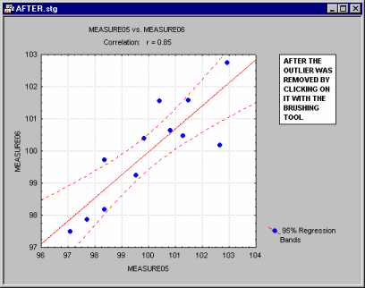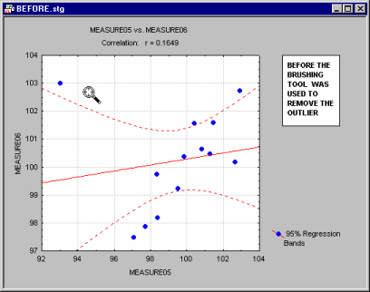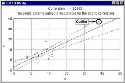 For example, a single outlier can "artificially" increase the value of a correlation between two variables to the point where it becomes highly significant. A scatterplot allows one to identify such anomalies. For example, the correlation between the two variables in the previous illustration would have been nearly 0 without the single outlier. The presence of this outlier "artificially" increases the value of the correlation to a highly significant value.
