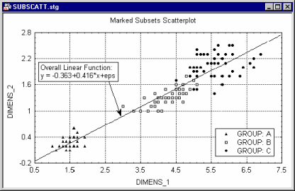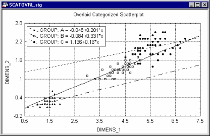 Categorized graphs fit separate functions to each subset of points (one function curve is drawn for each subset, as shown in the following example of an overlaid categorized scatterplot where three regression lines are plotted, one for each subset).
