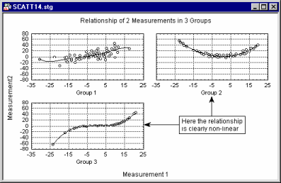 Curvilinearity is another aspect of the relationships between variables that can be examined in scatterplots. There are no "automatic" or easy-to-use tests to measure curvilinear relationships between variables: The standard Pearson r coefficient measures only linear relations; some nonparametric correlations such as the Spearman R can measure curvilinear relations, but not non-monotonous relations. Examining scatterplots allows you to identify the shape of relations, so that later an appropriate data transformation can be chosen to "straighten" the data or choose an appropriate nonlinear estimation equation to be fit.
