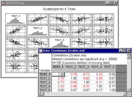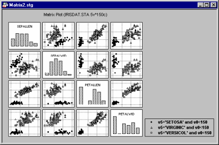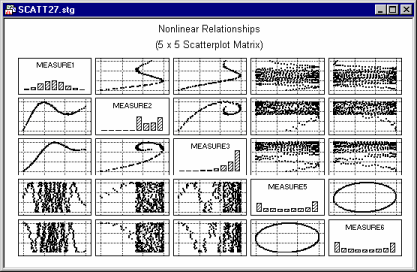 Matrix graphs summarize the relationships between several variables in a matrix of true X-Y plots. The most common type of matrix plot is the scatterplot matrix, which can be considered to be the graphical equivalent of the correlation matrix (e.g., see Basic Statistics and Tables).