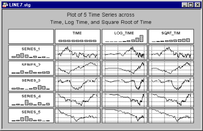 Here, several Y variables are plotted against a single X variable denoting time; thus, the "behavior" of several variables over time is summarized in this graph.