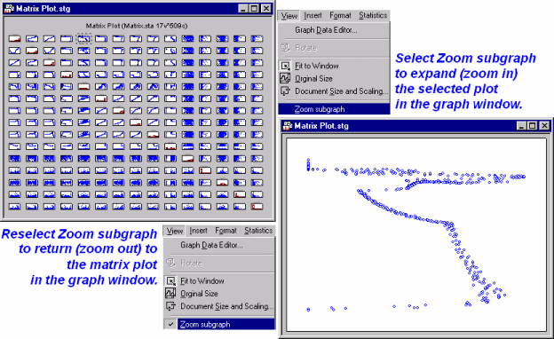 The density of this graph makes it difficult to examine individual scatterplots; however, you can easily "zoom-in" on individual graphs. To do this, select the plot by single-clicking in the area surrounding the individual scatterplot, then select Zoom subgraph from the View menu. In the illustration below, the fifth scatterplot on the top row has been selected and expanded in the matrix plot window. Once you have finished examining the individual plot, you can reset the matrix plot (i.e., return to the original matrix plot) by once again selecting View - Zoom subgraph.
