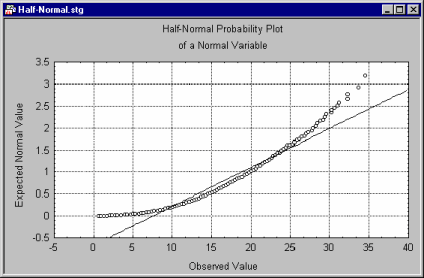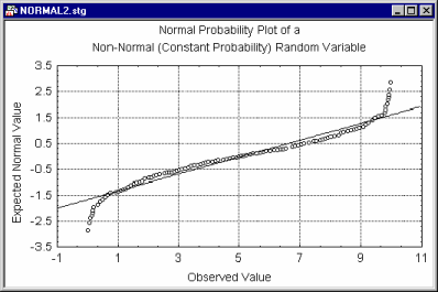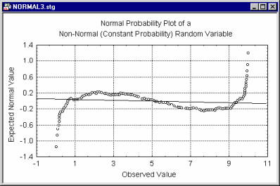 Outliers may also become evident in this plot. If there is a general lack of fit, and the data seem to form a clear pattern (e.g., an S shape) around the line, then the variable may have to be transformed in some way before it can be used in a procedure that assumes normality (e.g., a log transformation is often used to "pull in" the tail of the distribution; see Neter, Wasserman, and Kutner, 1985, page 134, for a discussion of such remedies for non-normality).