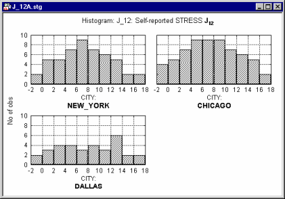 A variety of options is offered for selecting the subsets; the simplest of them is using a categorical variable (e.g., a variable City, with three values New York, Chicago, and Dallas). For example, the following graph shows histograms of a variable representing self-reported stress levels in each of the three cities.