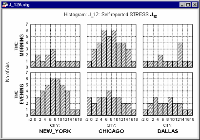 Adding this second factor reveals that the patterns of stress reporting in New York and Chicago are actually quite different when the Time of questioning is taken into consideration, whereas the Time factor makes little difference in Dallas.