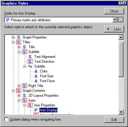 ) of a graph is an aspect of the graph that usually cannot be represented or summarized by a simple value, such as the Axis Display property. To edit property (see Managing and Editing Graphics Styles), select the Axis Display property and then click the Edit button. A (somewhat) complex dialog box is displayed with various settings that describe this aspect of the graph.