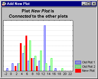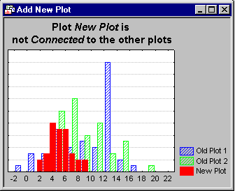 For example, suppose your current plot is a multiple histogram, where the columns for different variables for identical categories are displayed side-by-side. If you add another histogram plot (add a plot of type Histogram), and select the Connect to current plot's setting check box, then the data typed into the Graph Data Editor will be rendered in the graph as additional columns, displayed next to all other columns.