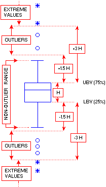 The following diagram illustrates the ranges of outliers and extremes in the classic box and whisker plot where the upper box value (UBV) is the 75th percentile, the lower box value (LBV) is the 25th percentile, and the outlier coefficient is equal to 1.5.