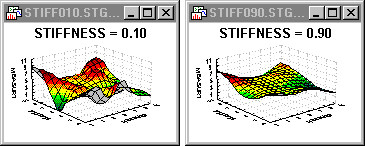 The range of the stiffness parameters is 0 < s < 1; if you specify values less than or equal to 0, or greater than or equal to 1, the respective fit line or surface may not be drawn in (may disappear from) the plot. Large values of the parameter produce smoother curves that adequately represent the overall pattern in the data set at the expense of local details. See also Negative Exponentially-Weighted Fitting. See also, McLain, 1974.