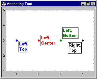 In this case the respective text was anchored to the plot point of the same color. Regardless of how much text you would add to each custom text, the respective corner or side of the text box would retain its relative position to the plot point; if the Dynamic (see above) attachment to the respective plot was chosen, then rescaling of the axes would not change the relative position to the points either.
