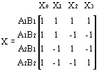 Factorial ANOVA designs contain X variables representing combinations of the levels of 2 or more categorical predictors (e.g., a study of boys and girls in four age groups, resulting in a 2 (Gender) x 4 (Age Group) design). In particular, full-factorial designs represent all possible combinations of the levels of the categorical predictors. A full-factorial design with 2 categorical predictor variables A and B each with 2 levels each would be called a 2 x 2 full-factorial design. Using the sigma-restricted coding, the X matrix for this design would be: