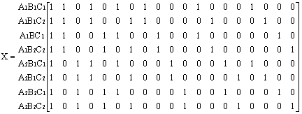 Several features of this X matrix deserve comment. Note that the X1 and X2 columns represent main effect contrasts for one variable, (i.e., A and B, respectively) collapsing across the levels of the other variable. The X3 column instead represents a contrast between different combinations of the levels of A and B. Note also that the values for X3 are products of the corresponding values for X1 and X2. Product variables such as X3 represent the multiplicative or interaction effects of their factors, so X3 would be said to represent the 2-way interaction of A and B. The relationship of such product variables to the dependent variables indicate the interactive influences of the factors on responses above and beyond their independent (i.e., main effect) influences on responses. Thus, factorial designs provide more information about the relationships between categorical predictor variables and responses on the dependent variables than is provided by corresponding one-way or main effect designs.