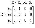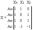 That is, cases in groups A1, A2, and A3 are all assigned values of 1 on X0 (the intercept), the case in group A1 is assigned a value of 1 on X1 and a value 0 on X2, the case in group A2 is assigned a value of 0 on X1 and a value 1 on X2, and the case in group A3 is assigned a value of -1 on X1 and a value -1 on X2. Of course, any additional cases in any of the 3 groups would be coded similarly. If there were 1 case in group A1, 2 cases in group A2, and 1 case in group A3, the X matrix would be: