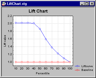 | Lift chart | This option is only applicable (available) for classification-type analyses (with a categorical dependent variable), when the categorical dependent variable is binary in nature, i.e., only contains two discrete values. The lift chart provides a visual summary of the usefulness of the information provided by a Statistical model for predicting a binomial (categorical) outcome variable (dependent variable). Specifically, the chart summarizes the gain that you can expect by using the respective predictive model compared to using baseline information only.