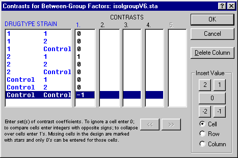 If you want to compare the performance of animals that were infected with the first virus (level 1 of the second independent variable STRAIN) and treated with the second drug (level 2 of the first independent variable DRUGTYPE) to the performance of animals in the isolated control group, the set of coefficients would look like this: