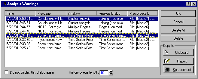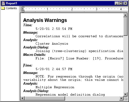 Usually, these warnings are not required that the respective analyses be terminated, but the information provided in these warnings may be important for you to be aware of. When such warning messages occur during the execution of a Statistica Visual Basic (SVB) program, the Analysis Warnings dialog box is displayed, which lists the warnings that have occurred, when they occurred (the time and in which specific analysis), the approximate line numbers in the SVB program code where the warnings occurred. For example, this log of errors might look like this: