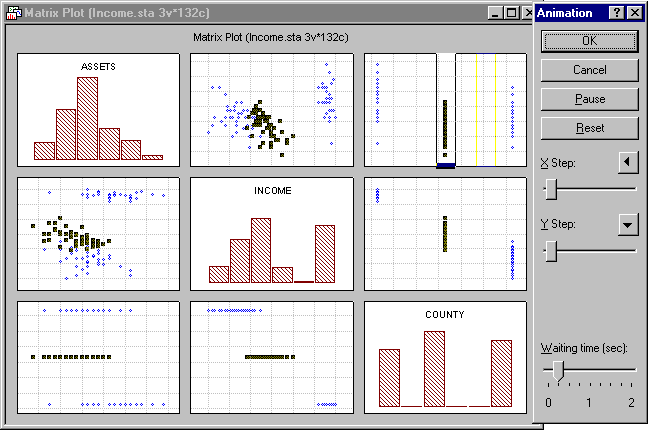 The region can be advanced automatically across groups of points in the Income, and the corresponding points will be highlighted in plots of the other three variables. The speed and direction of the movement can be interactively controlled in the Animation dialog box.