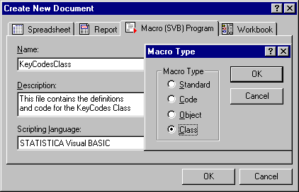 Create the following three files as Statistica Visual Basic macro programs. The first one defines Class as the Macro Type (when creating the new Visual Basic document); call this program KeyCodesClass. The screen below shows the selections from the Create New Document and the Macro Type dialogs to create the KeyCodesClass module.
