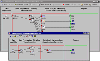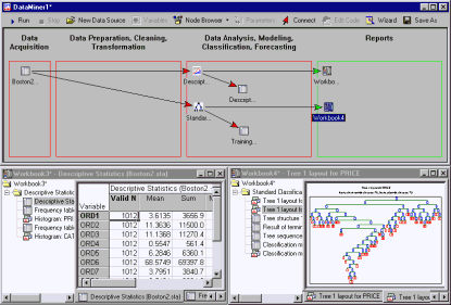 The data mining workspace is a structured, highly efficient, user-friendly data analysis environment, where you can move around and interconnect data, analyses, and results by simply dragging icons and connecting arrows. You can simultaneously open, modify, and run as many data mining workspaces as you like and drag nodes (objects) between workspaces and node browsers.