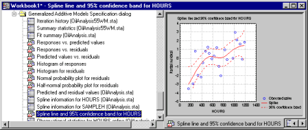 The program will report a comprehensive set of results statistics to aid in the evaluation of the model-adequacy, model fit, and interpretation of results; specifically, results include: the iteration history for the model fitting computations, summary statistics including the overall R-square value (computed from the deviance statistic) model degrees of freedom, and detailed observational statistics pertaining to the predicted response, residuals, and the smoothing of the predictor variables. Results graphs include plots of observed responses vs. residual responses, predicted values vs. residuals, histograms of observed and residual values, normal probability plots of residual values, and partial residual plots for each predictor, indicating the cubic spline smoothing fit for the final solution; for binary responses ( logit-models) lift charts can also be computed.